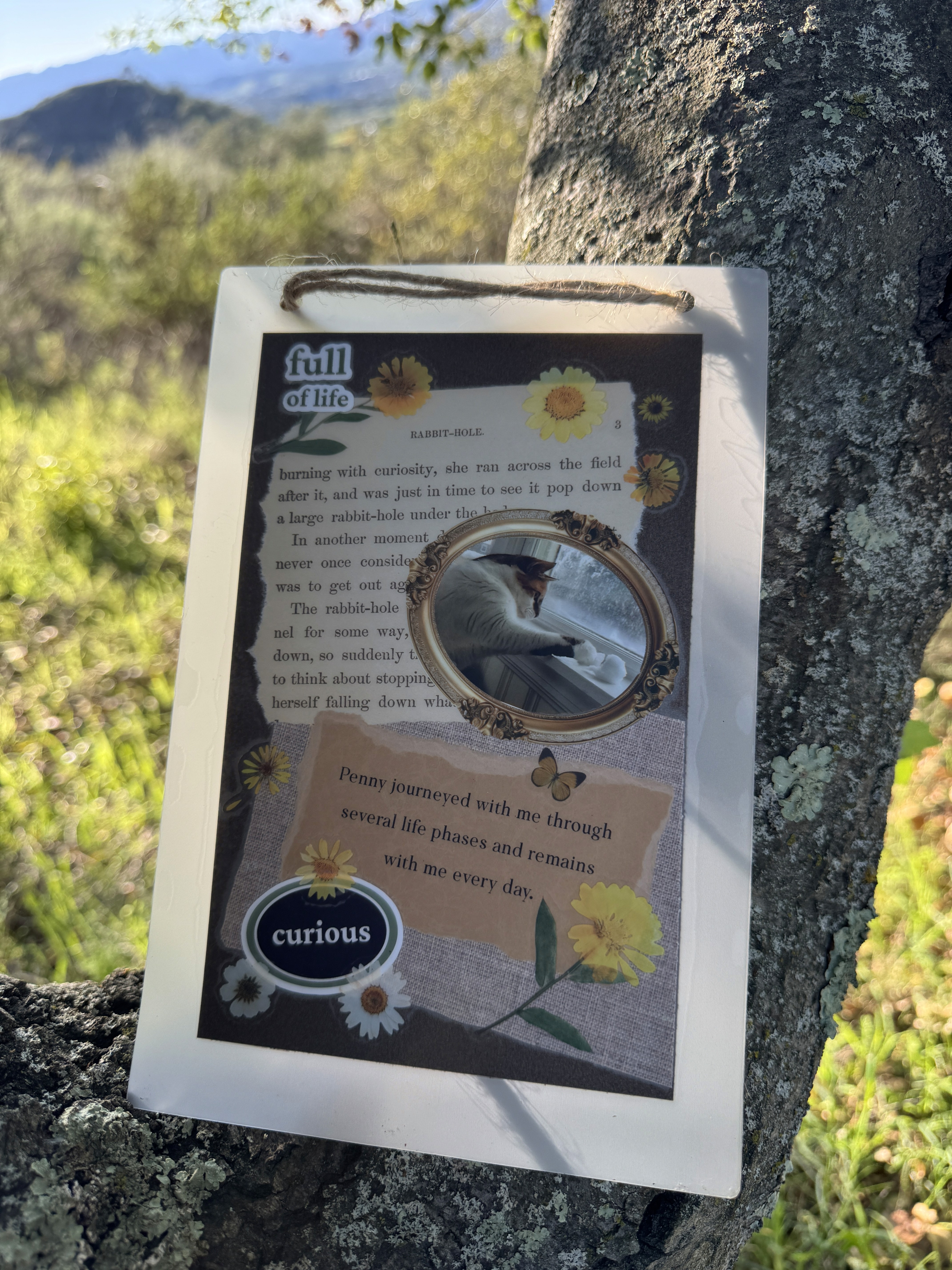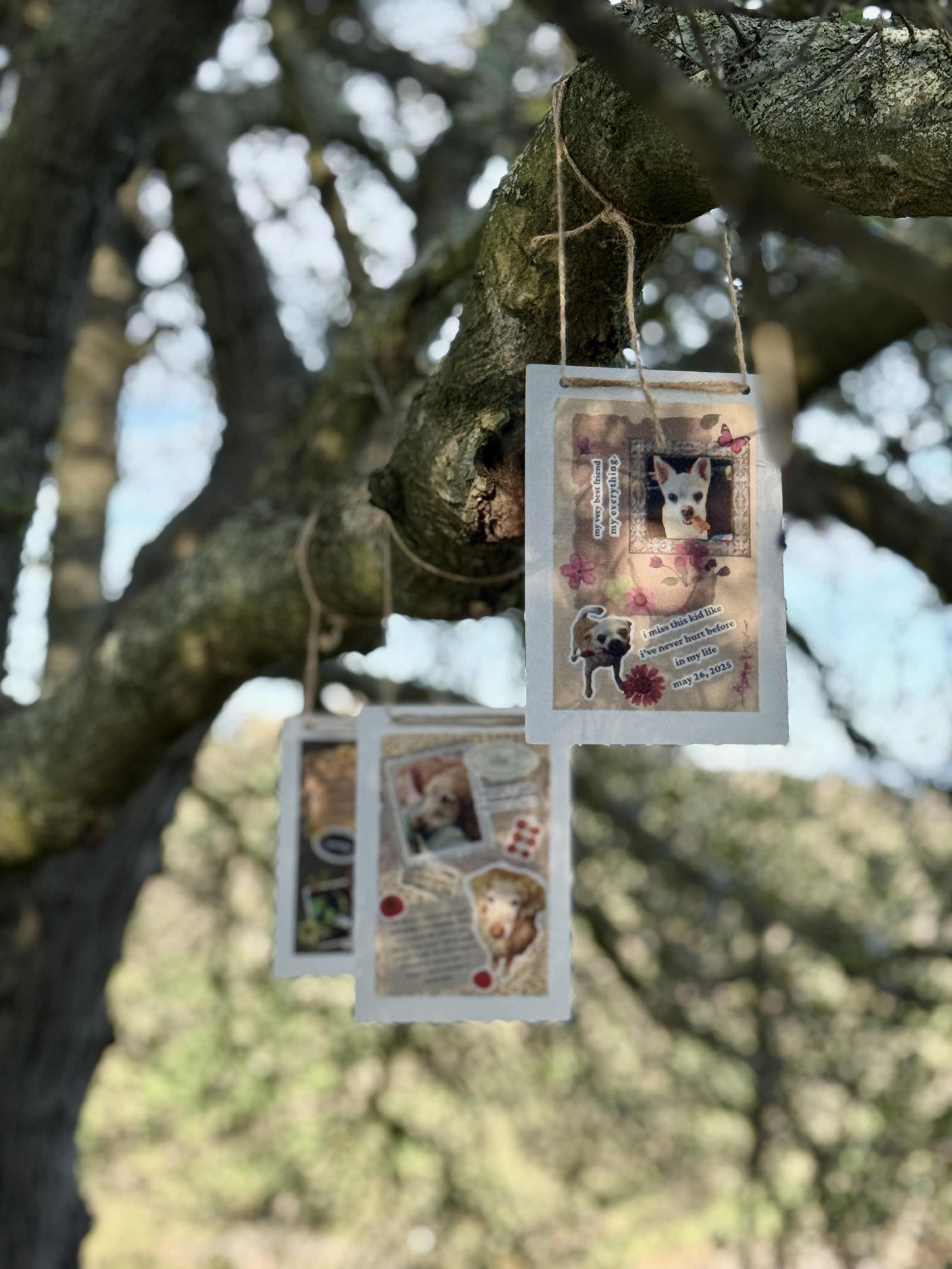 Each keepsake is a laminated memorial page with your pet's photos, name, and the words that matter to you. We tie it by hand to a branch, where it becomes part of this place through the turning seasons.