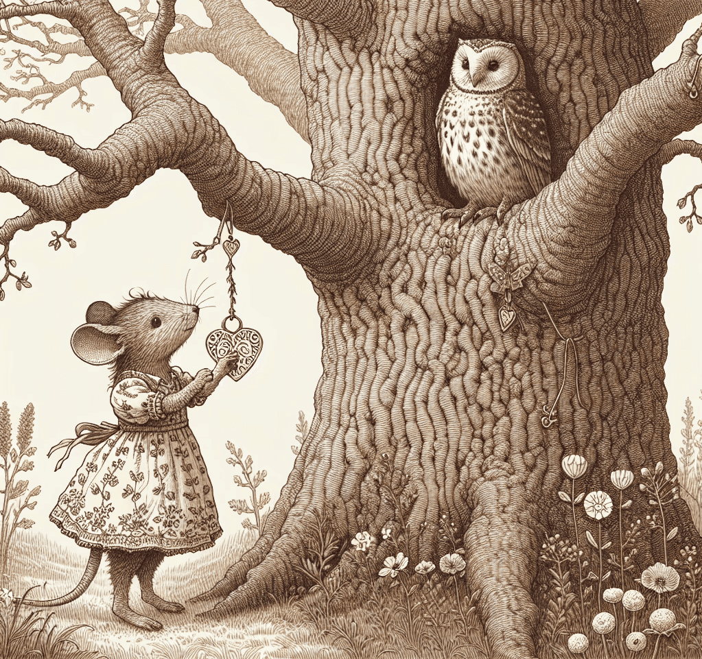 "Of course,” said Mr. Hoot. He showed her how to weave a tiny heart from bluebell petals. Little Whisker placed it under the oak, whispering thanks to Pippin.